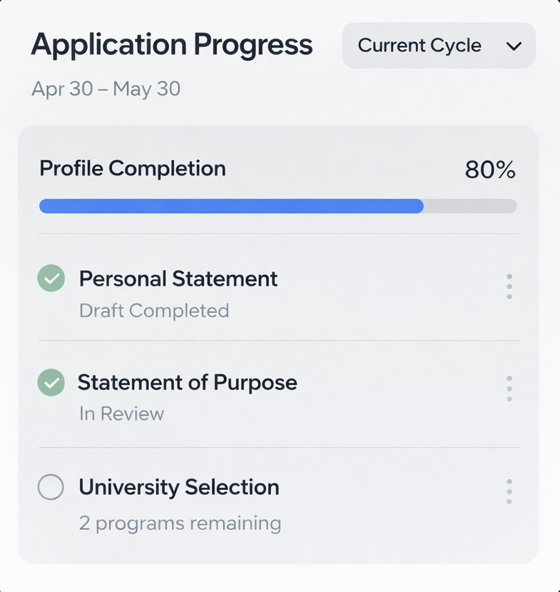 基于你的背景与申请目标,智能分析并推荐匹配度更高的院校与项目,帮助建立更合理的留学申请策略。